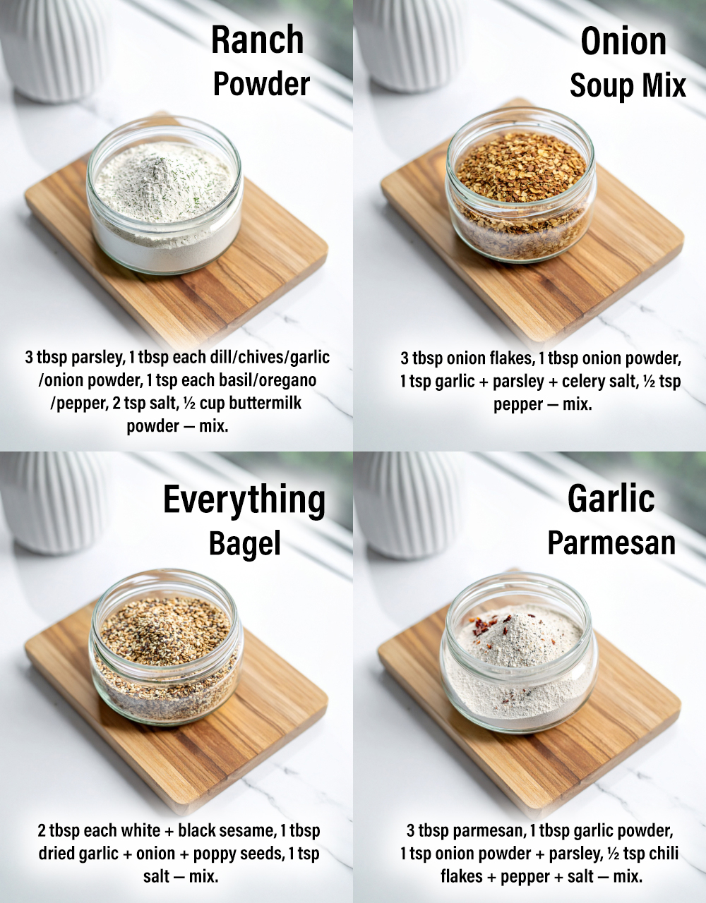 Homemade seasonings are a simple way to bring more flavor into everyday cooking without relying on unhealthy additives or store-bought mixes. With just a few dried herbs and spices, you can create blends that elevate vegetables, meats, soups, salads, and even snacks. These four mixesโ€”Ranch Powder, Garlic Parmesan, Onion Soup Mix, and Everything Bagel Seasoningโ€”are easy to make, budget-friendly, and wonderfully versatile.