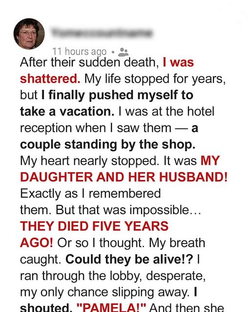 Their sudden passing left me utterly broken. Life seemed to halt, but eventually, I gathered the strength to take a vacation. As I stood at the hotel reception, I noticed a couple near the shop. My heart felt like it would burst from my chestโit was my daughter and her husband, standing there just as I remembered them! They had passed on five years ago, or so I believed. Out of breath and frantic, I ran across the lobby, terrified of missing this chance. I shouted, โPAMELA!โ Desperately wanting her to hear me. Then she turned, her bright eyes meeting mine.