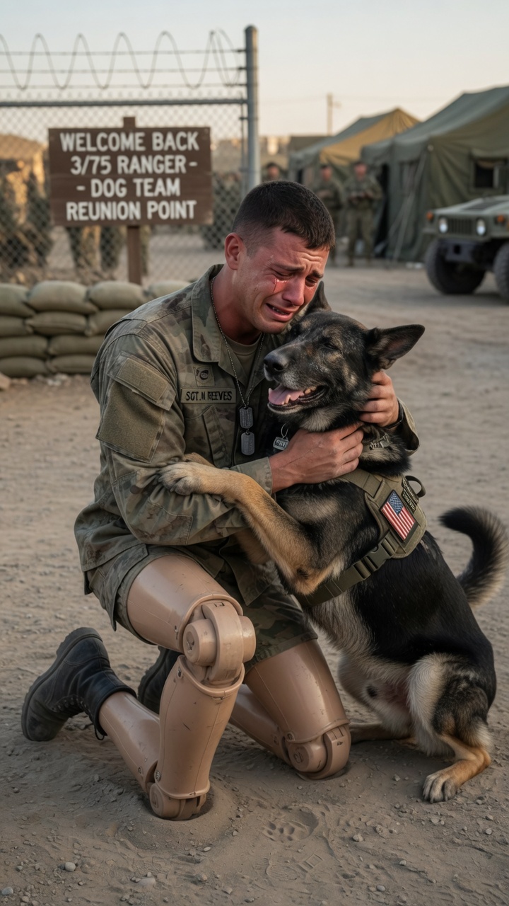He stood frozen at the edge of the crate, ears pinned back, scanning. His nose twitched. Once. Twice. I watched his eyes move over the prosthetic leg. The compression sleeve hiding the grafts on my arms. The face that used to laugh with him in 120-degree heat.