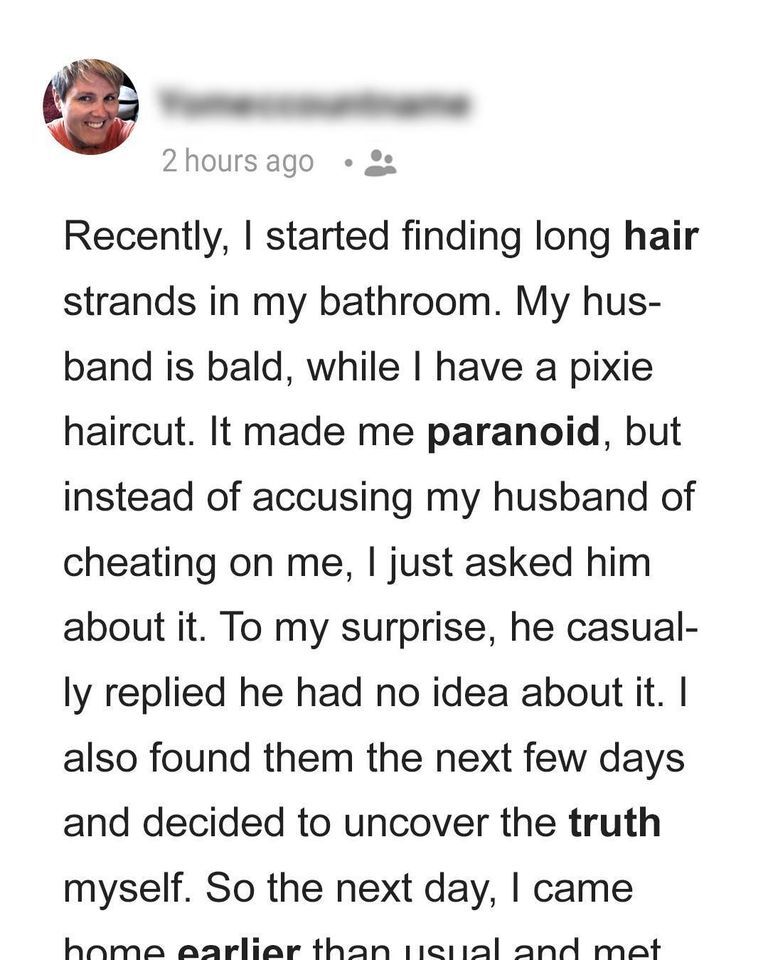 Yet, the long hair strands kept appearing in the bathroom. Each time, her husband dismissed her concerns, leaving her feeling increasingly uneasy. She needed to get to the bottom of this mystery.