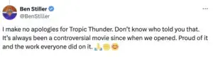 Despite these controversies, Stiller, who directed and co-wrote the film, remains defensive of Tropic Thunder and its intentions. Engaging with an audience member on X (formerly Twitter), he reaffirmed his stance by stating: โ€œI make no apologies for Tropic Thunder. Not sure who told you that.โ€ He further explained, โ€œItโ€™s always been a controversial movie since it opened. Proud of it and the work everyone did on it.โ€