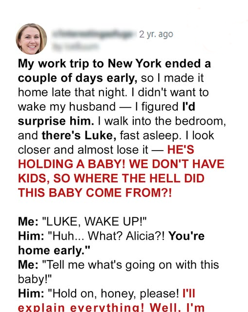 Thinking sheโd surprise Luke, Alicia navigated the home silently, the glow of the moonlight guiding her into the bedroom. But what awaited her was beyond any expectationโa small baby soundly asleep beside her husband.