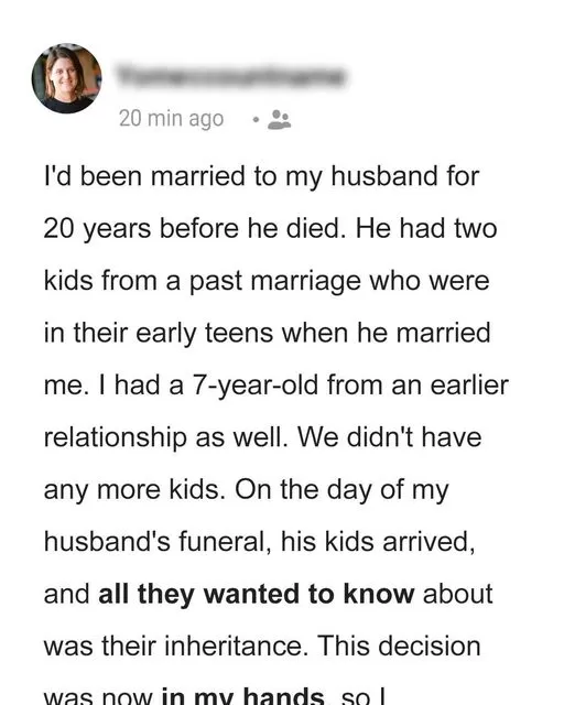 A woman, recently widowed, found herself in a challenging position after her husband’s passing. Her late husbandโ€™s estate, which amounted to a modest $25,000, was left entirely to her. However, it wasnโ€™t the inheritance she expected that made this situation unusual, but what she chose to do with it that turned heads and raised eyebrows.