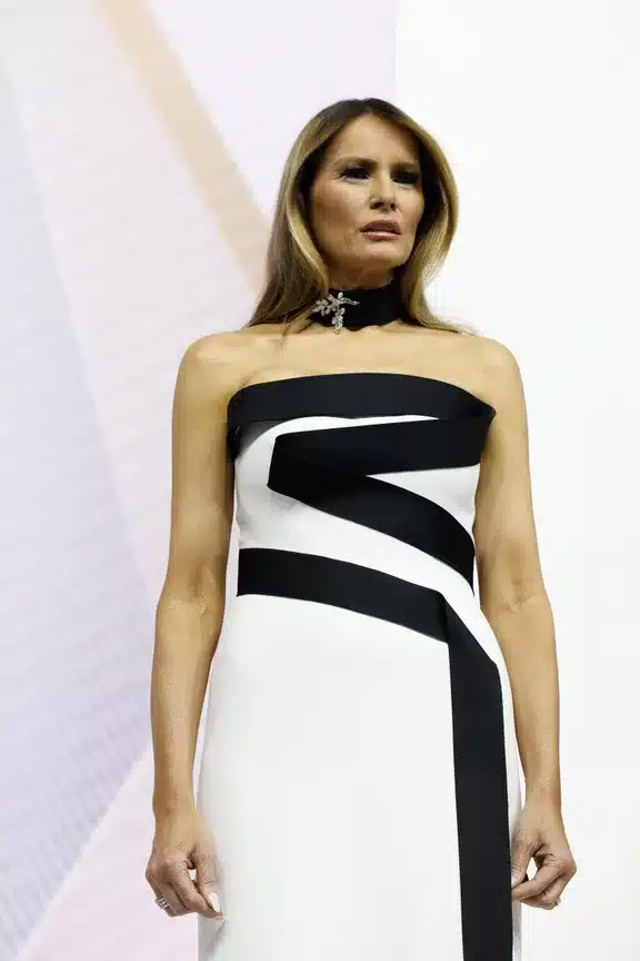 A significant part of the event was Melaniaโs outfit, which didnโt go unnoticed. Her stylish white gown with bold black accents, crafted by Herve Pierre, caught plenty of attention. The asymmetrical design complemented by a black choker with a sparkling diamond ensured she looked elegant and sophisticated. Herve Pierre, Melania’s stylist, expressed his joy in creating the design, drawing inspiration from her love of clean, striking contrasts.