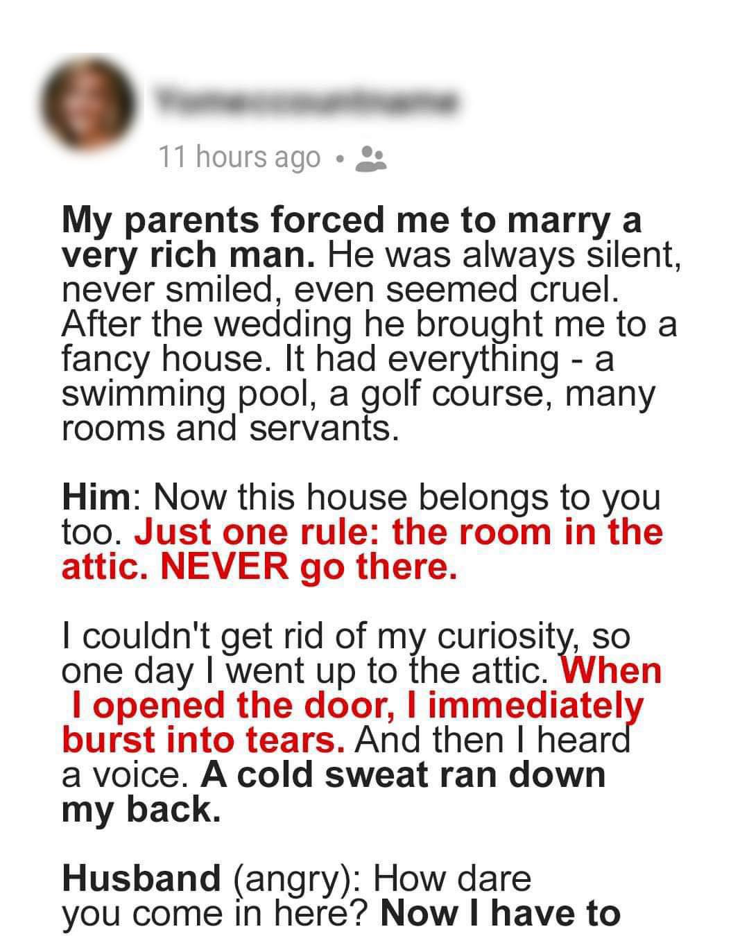 Upon moving into Robert’s impressive home, Alexis was met with an unusual but firm instruction: she was never to enter the attic. At first, this piqued her curiosity, but she respected Robertโs wishes. However, as time passed, the mystery of that forbidden place tugged more insistently at her thoughts.