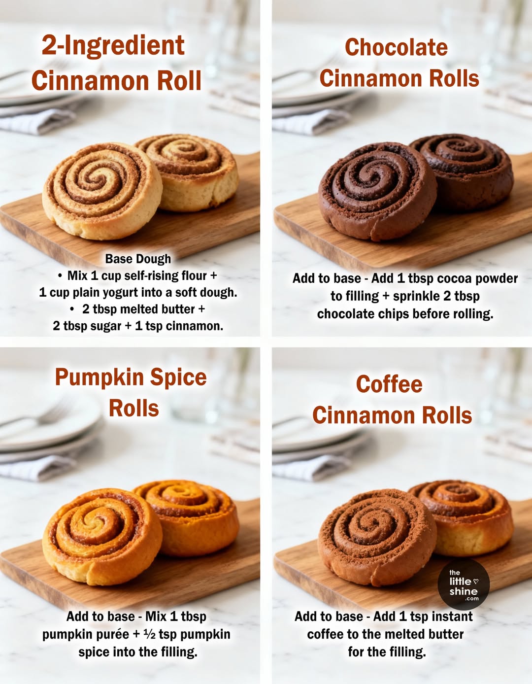 With just two basic ingredients and a few creative fillings, you can enjoy homemade cinnamon rolls anytime. Theyโre easy, versatile, and made with wholesome ingredientsโperfect for a warm, comforting treat straight from your oven.