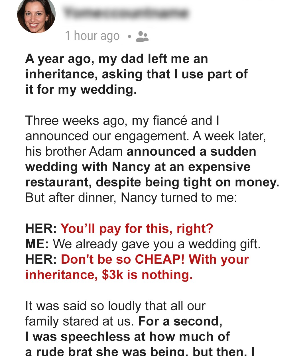 Nancy prepared to speak again, but I raised a hand. โNo, Nancy. This isnโt how you treat family, or anyone for that matter. Weโre happy to celebrate with you, but this isnโt our responsibility.โ