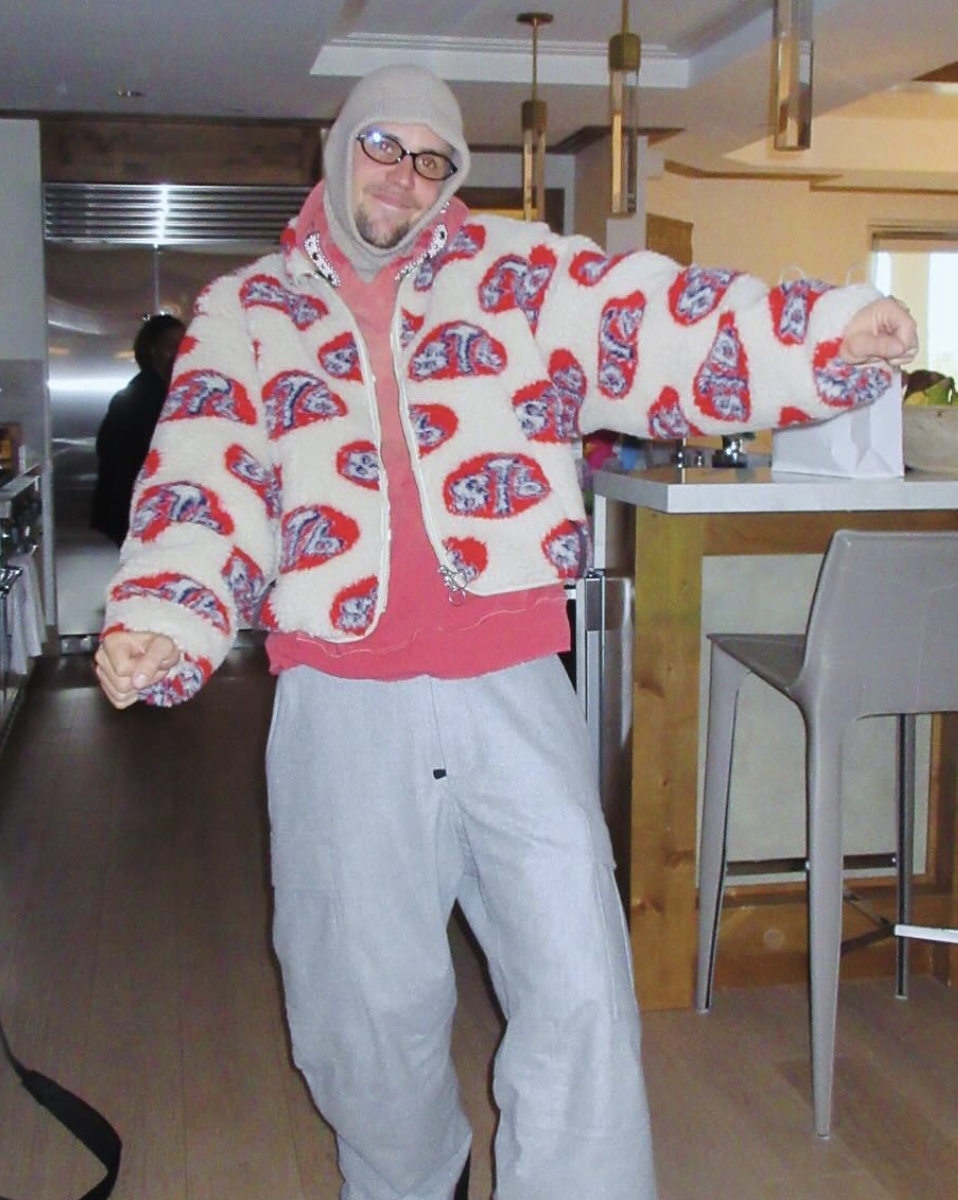 The images depict Justin sitting comfortably with a bong positioned between his legs and a cozy blanket draped over his shoulders.