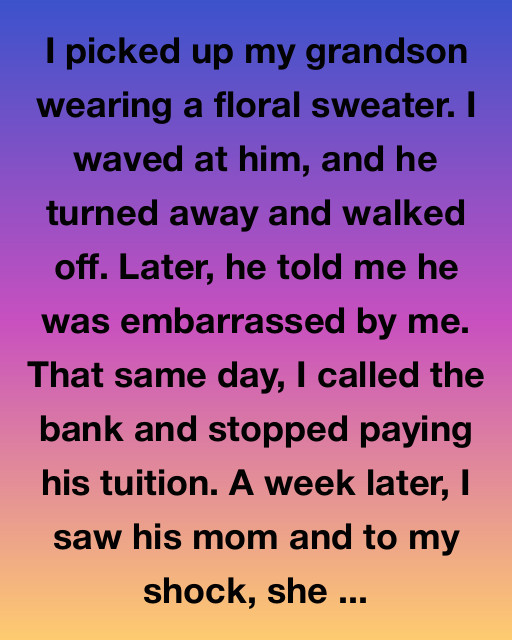 I picked up my grandson wearing a floral sweater. I waved at him, and he turned away and walked off. Later, he told me he was embarrassed by me. That same day, I called the bank and stopped paying his tuition. A week later, I saw his mom and to my shock, she was wearing the same exact floral sweater I had on that day.