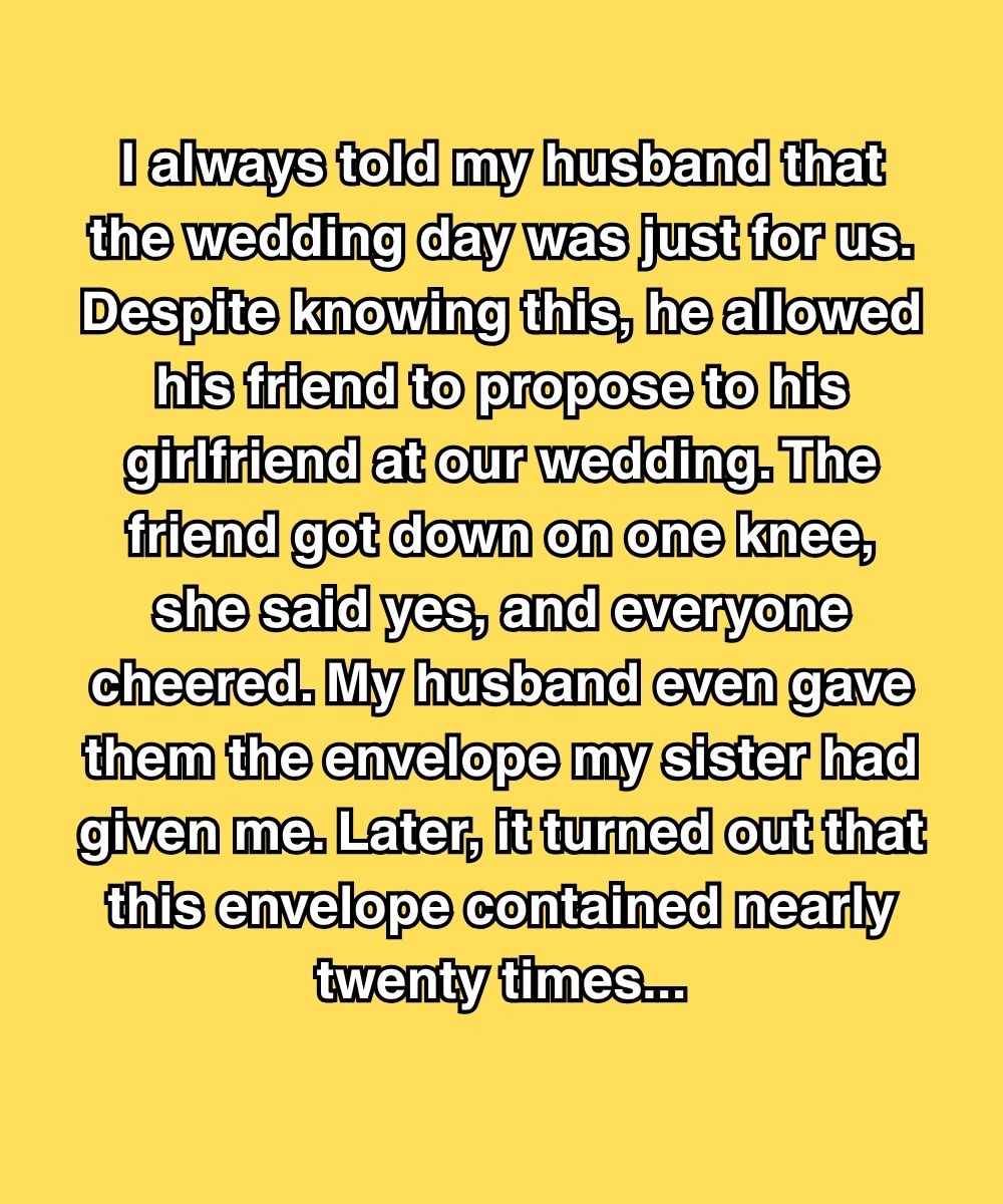 I always told my husband that the wedding day was just for us. Despite knowing this, he allowed his friend to propose to his girlfriend at our wedding. The friend got down on one knee, she said yes, and everyone cheered. My husband even gave them the envelope my sister had given me. Later, it turned out that this envelope contained nearly twenty times what we thought it did.