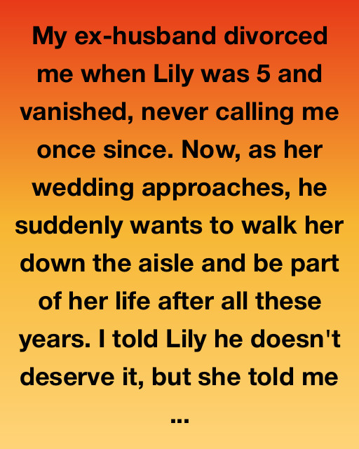 My ex-husband divorced me when Lily was 5 and vanished, never calling me once since. Now, as her wedding approaches, he suddenly wants to walk her down the aisle and be part of her life after all these years. I told Lily he doesn’t deserve it, but she told me everyone deserves one last chance.