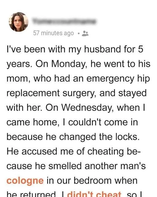 While her husband was away, she continued her activities. When he returned, he questioned why their home, especially the bedroom, smelled of cologne. She was puzzled and didn’t engage in the conversation as she was late for work. But when she came back, she found herself locked out.