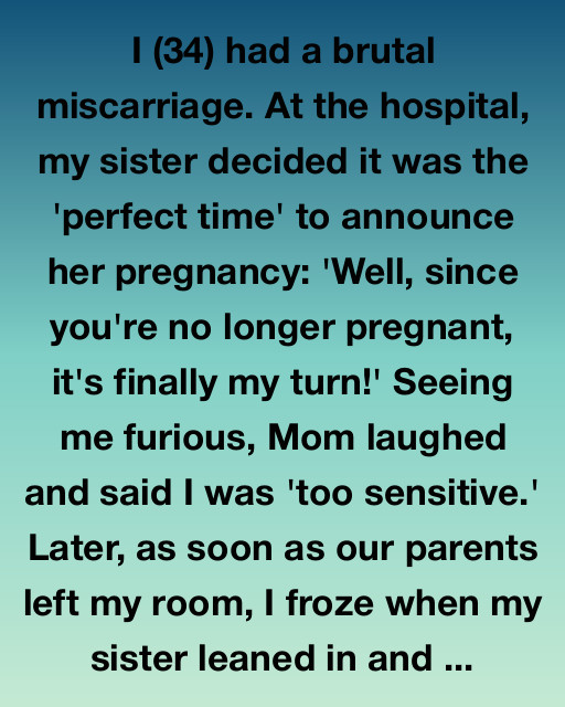 I (34) had a brutal miscarriage. At the hospital, my sister decided it was the “perfect time” to announce her pregnancy: “Well, since you’re no longer pregnant, it’s finally my turn!” Seeing me furious, Mom laughed and said I was “too sensitive.” Later, as soon as our parents left my room, I froze when my sister leaned in and whispered, “I always knew you’d mess it up. It was never meant for you.”