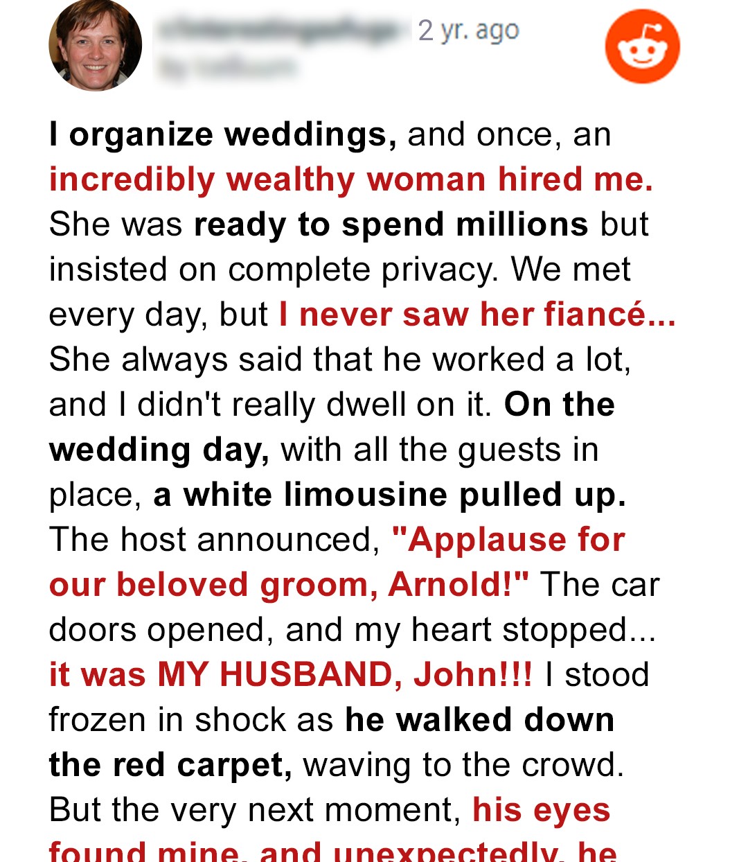 One remarkable day, I found myself managing the wedding of an exceptionally wealthy woman. I’ve always been deeply involved in creating memorable events, but this situation took a strange turn when I finally laid eyes on the groom. To my shock, it was none other than my husband, John!
