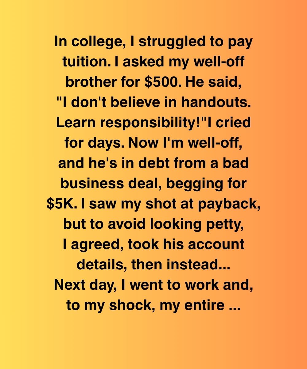 In college, I struggled to pay tuition. I asked my well-off brother for $500. He said, “I don’t believe in handouts. Learn responsibility!” I cried for days. Now I’m well-off, and he’s in debt from a bad business deal, begging for $5K. I saw my shot at payback, but to avoid looking petty, I agreed, took his account details, then instead…
