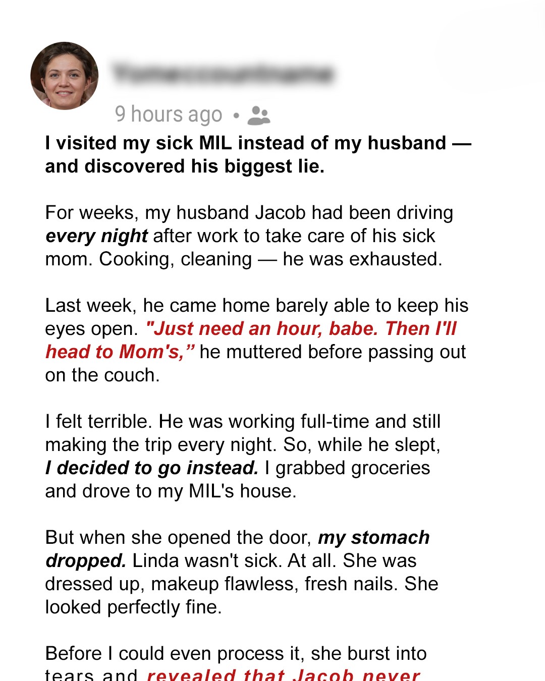 When I decided to visit my mother-in-law, thinking she was sick, my main goal was to give my husband, Jacob, a much-needed break. We had been led to believe she was unwell, and I was ready for discomfort or awkward moments during the visit. But I’ll tell you, nothing could have prepared me for what unfolded. Imagine my surprise when I found her as fit as a fiddle; she wasn’t ill at all. If Jacob wasn’t spending his evenings caring for her, where on earth had he been?