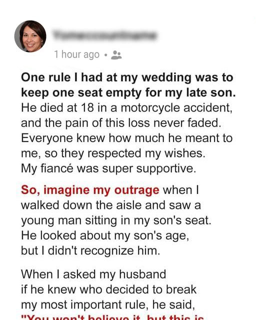 Everyone was aware of the significance of that empty chair. My fiancรฉ, Mark, had been a pillar of support throughout. He had held me close during my tearful moments over wedding plans, never once questioning the importance of the empty seat. My family and friends were all deeply understanding. That chair was sacred; it was Aaronโs seat, and no one elseโs.