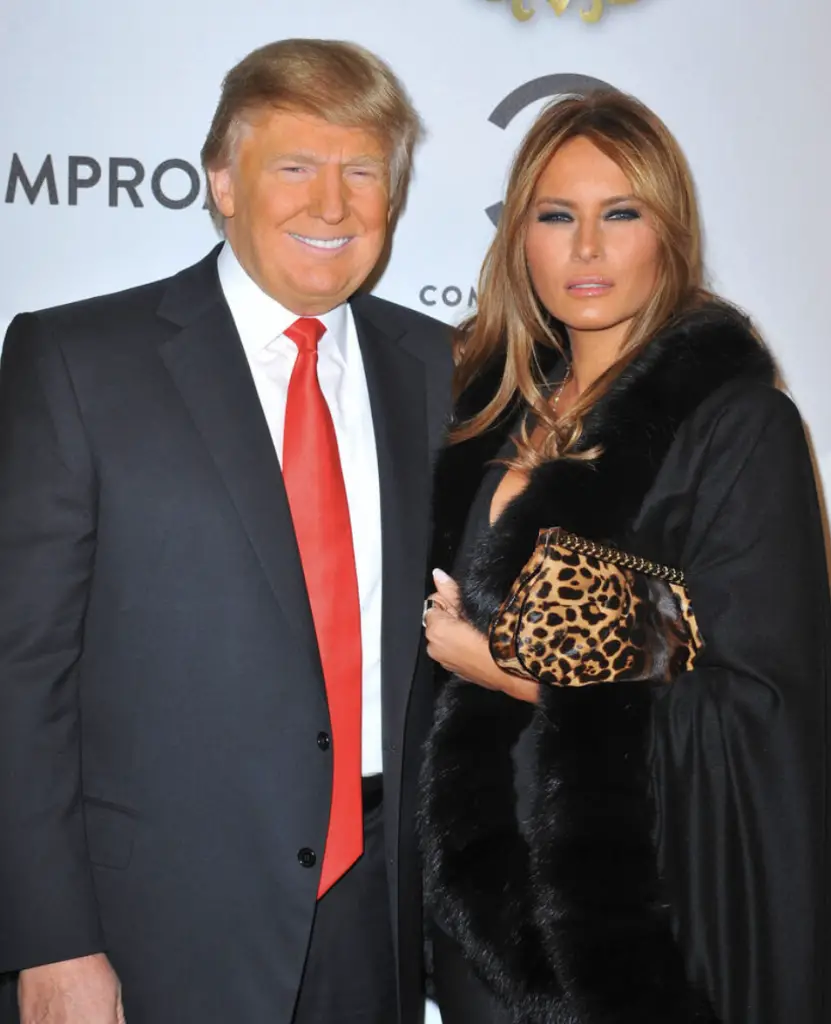 Donning a sharp, tailored dark business suit, Melania is posed with her hands on a polished table, projecting a commanding and sophisticated image. Some have noted that this fits right into the Trump family’s signature style.