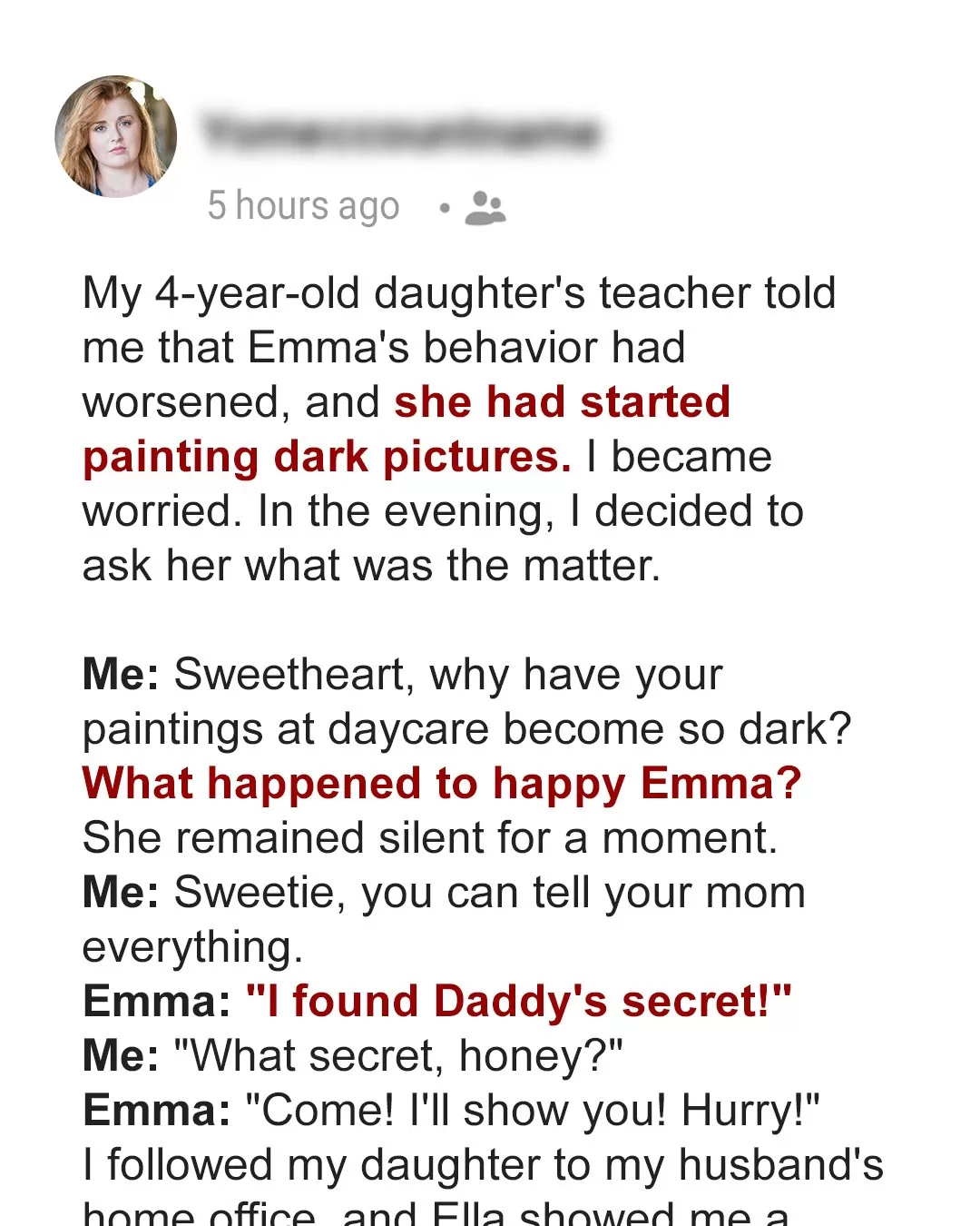 Jennifer had recently begun noticing some unsettling changes in her daughter Emma’s behavior. This became all too clear after a parent-teacher meeting, where she saw Emma’s troubling drawings, which seemed dark and unlike the cheerful art her daughter usually created. It was shocking for Jennifer, as she had always known Emma to be a happy and lively 4-year-old.