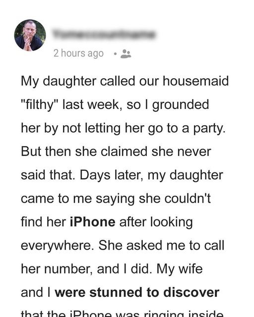 Later that day, I talked to Melanie about it, wanting to hear her side. She seemed confused and firmly denied saying such a thing. I was caught in a dilemma, though. Rosa had been visibly upset, and I trusted her, so I decided to take some action. Regrettably, I grounded Melanie, which meant missing a friend’s birthday party that weekend. She pleaded with me, tears brimming in her eyes, insisting that she didn’t use the word “filthy”. Yet, I stood by my decision, reminding her that it’s crucial to treat everyone with dignity, particularly those who work for us.