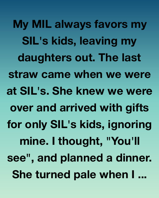 My MIL always favors my SIL’s kids, leaving my daughters out. The last straw came when we were at SIL’s. She knew we were over and arrived with gifts for only SIL’s kids, ignoring mine. I thought, “You’ll see,” and planned a dinner. She turned pale when I asked my daughters loudly, “Girls, do you want to help me set the table for the family who truly loves and respects you?”