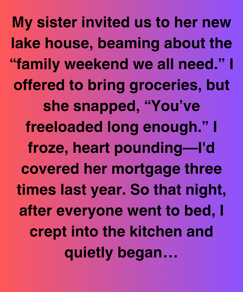My sister invited us to her new lake house, beaming about the “family weekend we all need.” I offered to bring groceries, but she snapped, “You’ve freeloaded long enough.” I froze, heart pounding—I’d covered her mortgage three times last year.