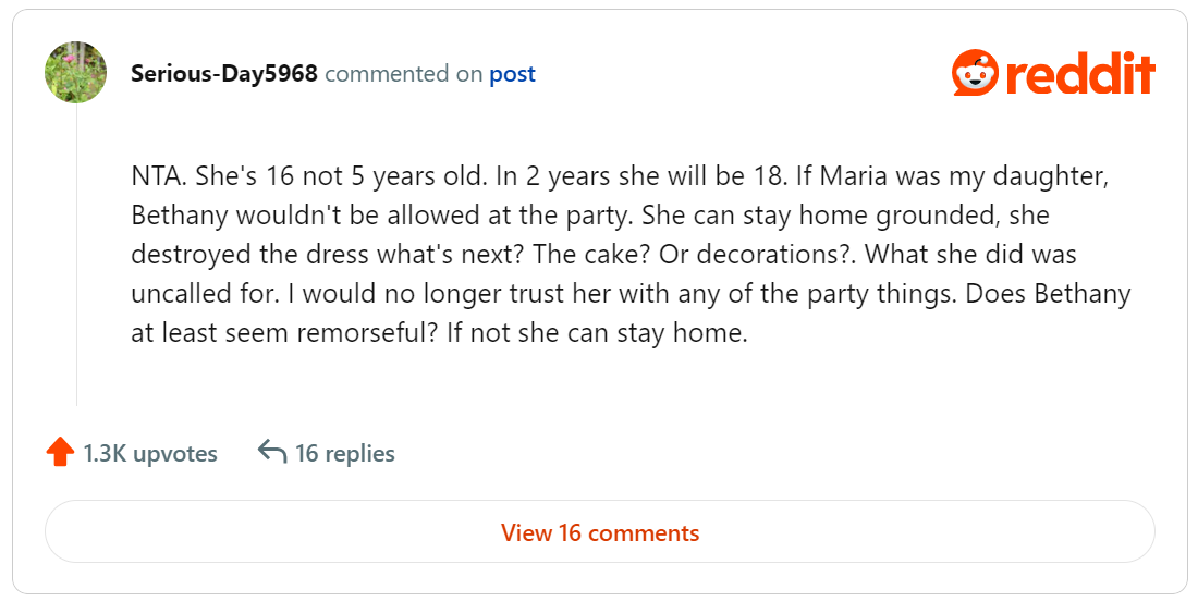 She shared her dilemma on a popular online forum where the vast majority supported her stance. One community member mentioned, “Bethany committed a very wrong and cruel act, and it is justified that she should repay the cost of the dress.” Another member highlighted the gravity of Bethany’s deed, commenting, “Her actions are legally considered malicious damage to property.”