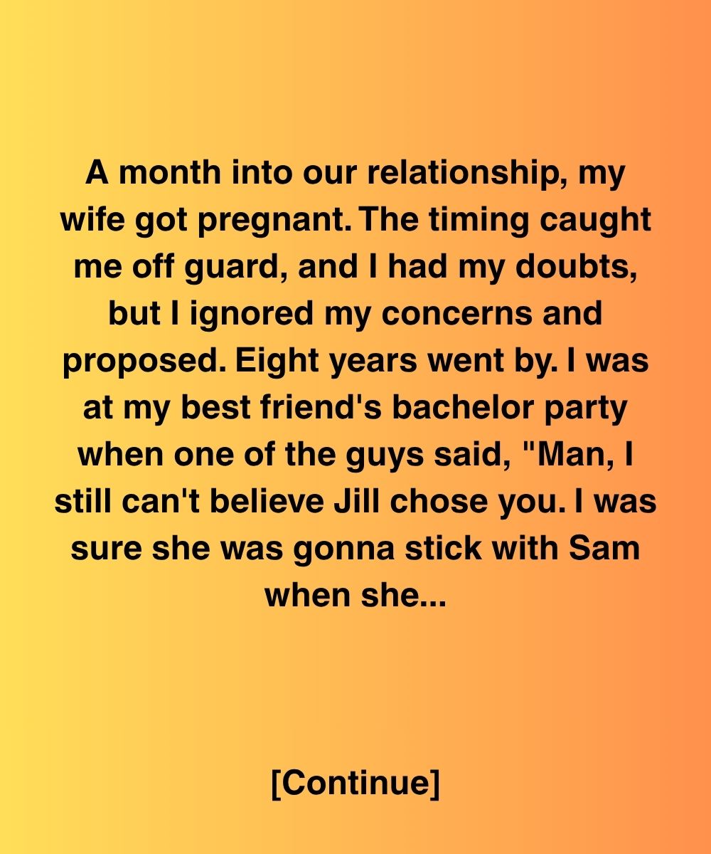 A month into our relationship, my wife got pregnant. The timing caught me off guard, and I had my doubts, but I ignored my concerns and proposed. Eight years went by. I was at my best friend’s bachelor party when one of the guys said, “Man, I still can’t believe Jill chose you. I was sure she was gonna stick with Sam when she…”