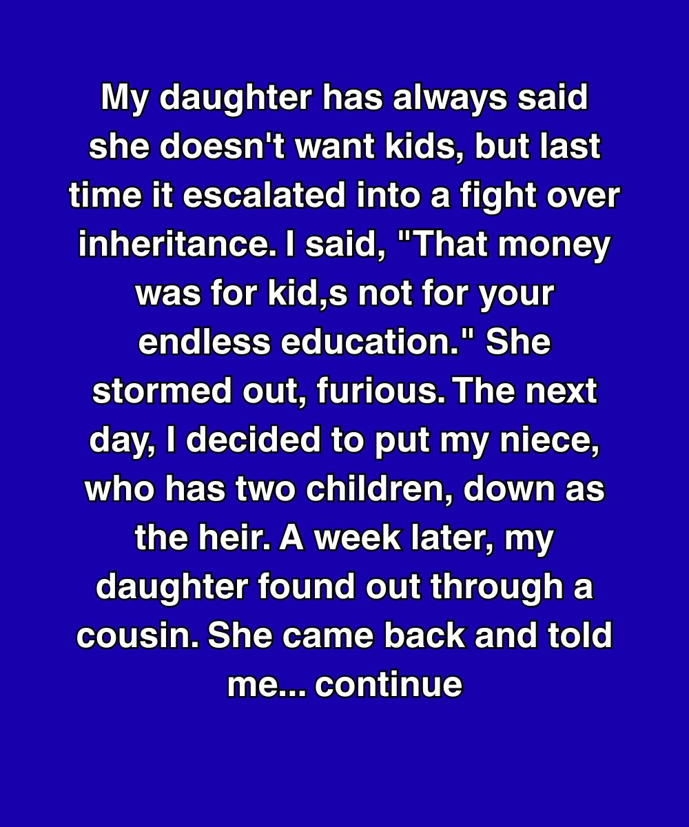 My daughter has always said she doesn’t want kids, but last time it escalated into a fight over inheritance. I said, “That money was for kids, not for your endless education.” She stormed out, furious.
