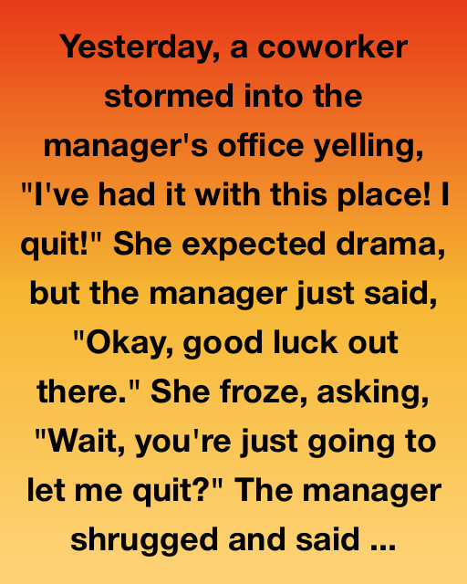 Yesterday, a coworker stormed into the manager’s office yelling, “I’ve had it with this place! I quit!” She expected drama, but the manager just said, “Okay, good luck out there.” She froze, asking, “Wait, you’re just going to let me quit?” The manager shrugged and said, โWell, it sounded like a final decision.โ