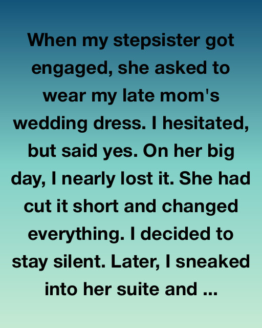 When my stepsister got engaged, she asked to wear my late mom’s wedding dress. I hesitated, but said yes. On her big day, I nearly lost it. She had cut it short and changed everything. I decided to stay silent. Later, I sneaked into her suite and found the dress bunched in a plastic laundry bag like it was nothing special. Just… tossed there. My stomach turned.