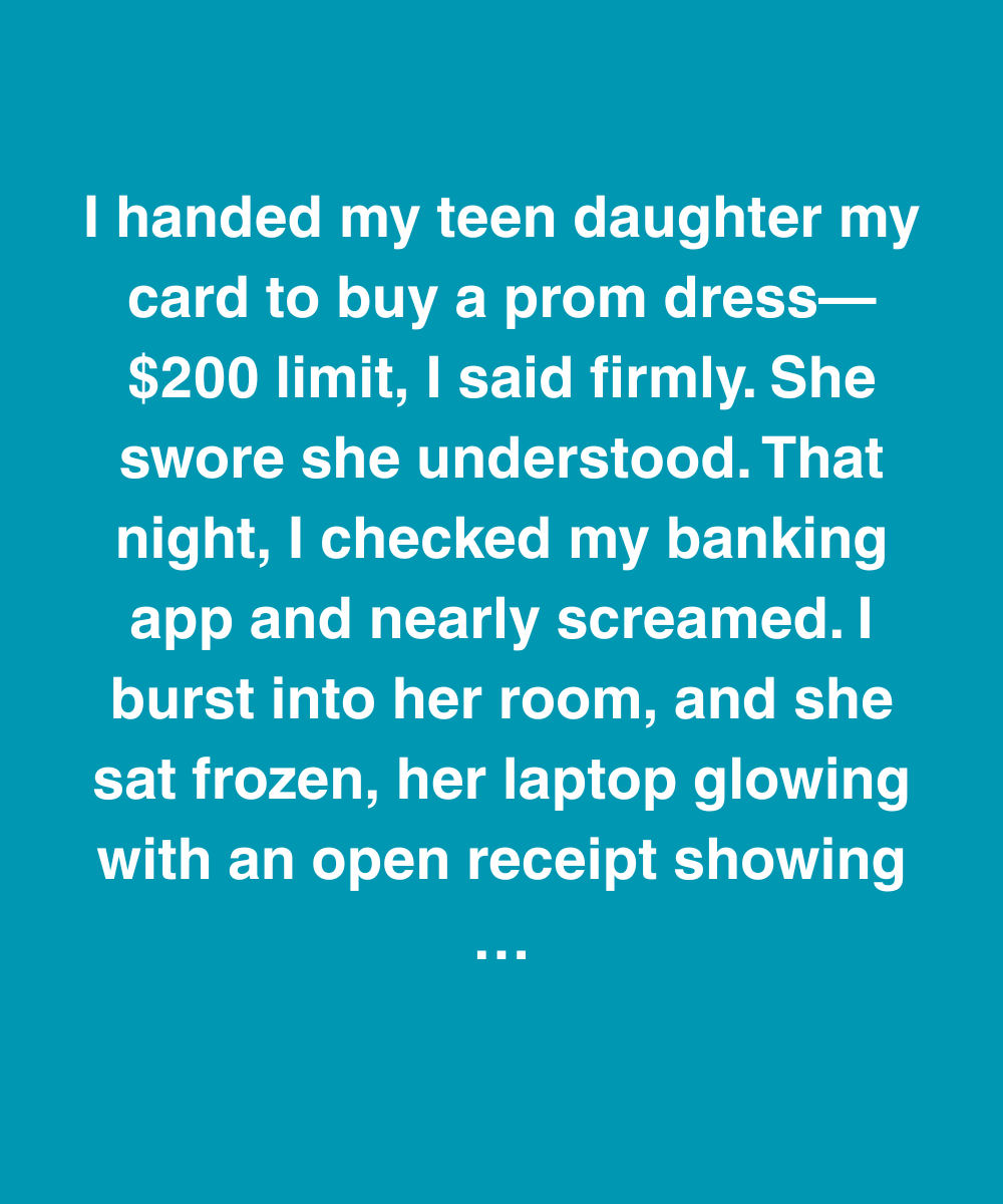 I handed my teen daughter my card to buy a prom dressโ$200 limit, I said firmly. She swore she understood. That night, I checked my banking app and nearly screamed. I burst into her room, and she sat frozen, her laptop glowing with an open receipt showing a $684 charge from some high-end boutique downtown.