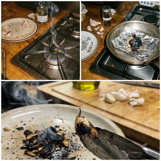 - The Ignition: Hold the garlic clove directly over the flame. Let the outer skin catch fire and begin to char.