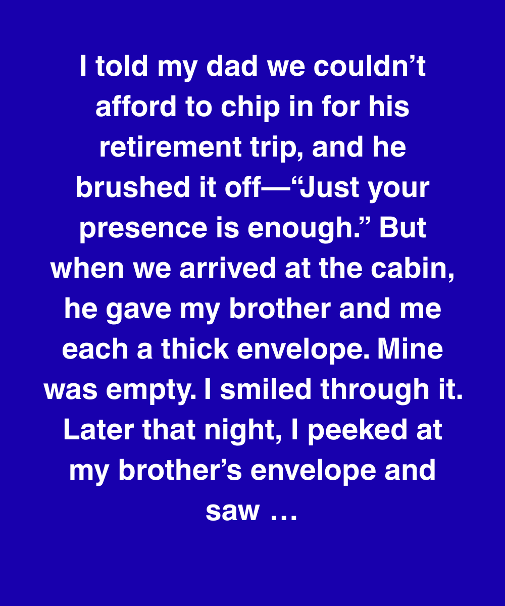 I told my dad we couldnโ€™t afford to chip in for his retirement trip, and he brushed it offโ€”โ€œJust your presence is enough.โ€ But when we arrived at the cabin, he gave my brother and me each a thick envelope. Mine was empty. I smiled through it. Later that night, I peeked at my brotherโ€™s envelope and saw a check for $15,000.