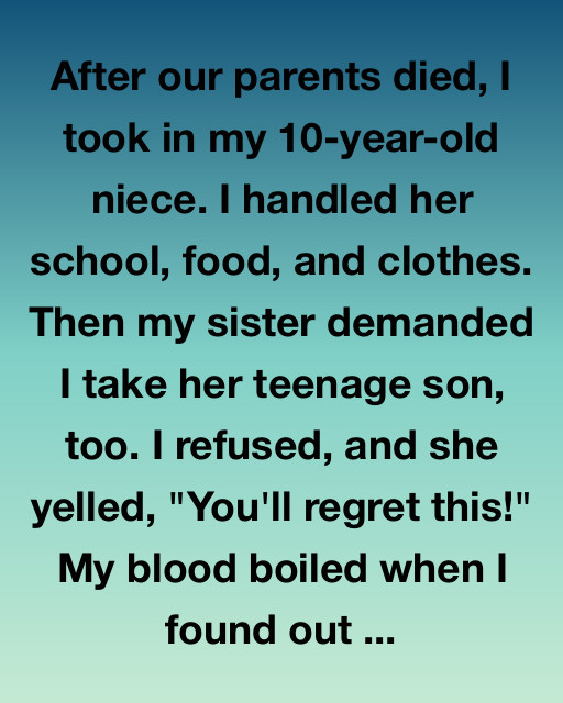 After our parents died, I took in my 10-year-old niece. I handled her school, food, and clothes. Then my sister demanded I take her teenage son, too. I refused, and she yelled, “You’ll regret this!” My blood boiled when I found out she left him with a neighbor and disappeared for weeks.