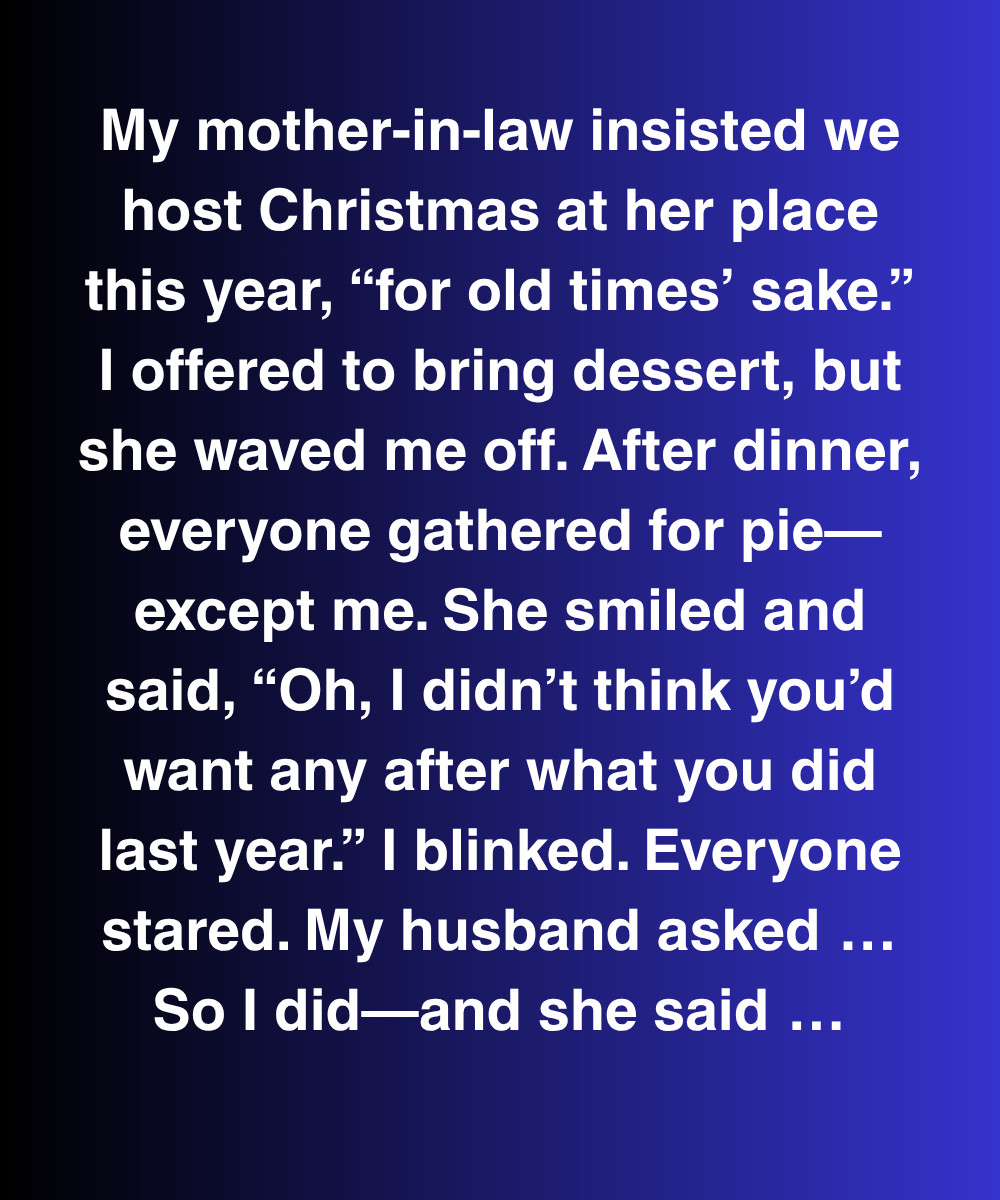 My mother-in-law insisted we host Christmas at her place this year, โfor old timesโ sake.โ I offered to bring dessert, but she waved me off. After dinner, everyone gathered for pieโexcept me. She smiled and said, โOh, I didnโt think youโd want any after what you did last year.โ I blinked. Everyone stared. My husband asked, โWaitโwhat did she do last year?โ