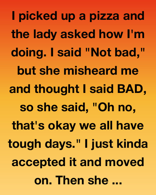 I picked up a pizza and the lady asked how I’m doing. I said “Not bad,” but she misheard me and thought I said BAD, so she said, “Oh no, that’s okay, we all have tough days.” I just kinda accepted it and moved on. Then she handed me the box with a smile, looked me straight in the eye, and said, โI hope the rest of your day gets better.โ