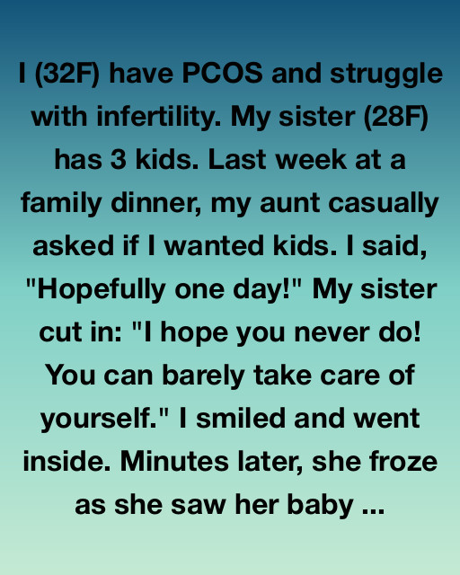 I (32F) have PCOS and struggle with infertility. My sister (28F) has 3 kids. Last week at a family dinner, my aunt casually asked if I wanted kids. I said, “Hopefully one day!” My sister cut in: “I hope you never do! You can barely take care of yourself.” I smiled and went inside. Minutes later, she froze as she saw her baby crawling toward the back porch stairs—alone.