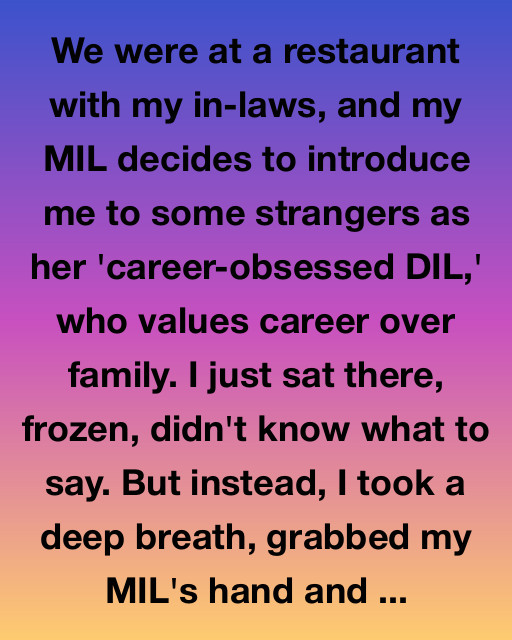 We were at a restaurant with my in-laws, and my MIL decides to introduce me to some strangers as her โcareer-obsessed DIL,โ who values career over family. I just sat there, frozen, didnโt know what to say. But instead, I took a deep breath, grabbed my MILโs hand and smiled.