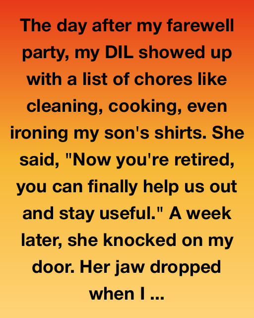 The day after my farewell party, my daughter-in-law showed up with a list of chores like cleaning, cooking, even ironing my son’s shirts. She said, “Now you’re retired, you can finally help us out and stay useful.” A week later, she knocked on my door. Her jaw dropped when I opened it, suitcase in hand, wearing a bright yellow sundress and sunglasses.