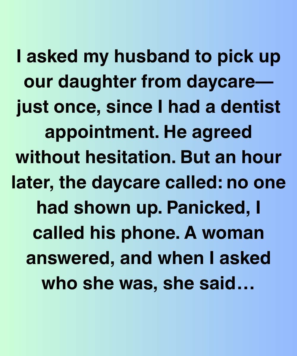 I asked my husband to pick up our daughter from daycare—just once, since I had a dentist appointment. He agreed without hesitation. But an hour later, the daycare called: no one had shown up. Panicked, I called his phone. A woman answered, and when I asked who she was, she said…”this is Cassia. Who is this?”