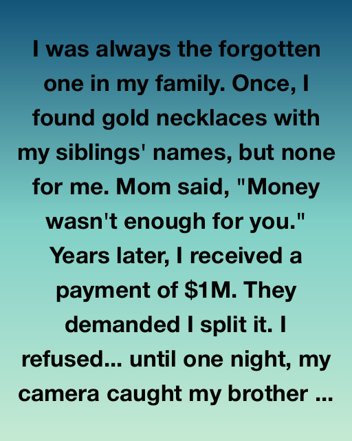 I was always the forgotten one in my family. Once, I found gold necklaces with my siblings’ names, but none for me. Mom said, “Money wasn’t enough for you.” Years later, I received a payment of $1M. They demanded I split it. I refused… until one night, my camera caught my brother.