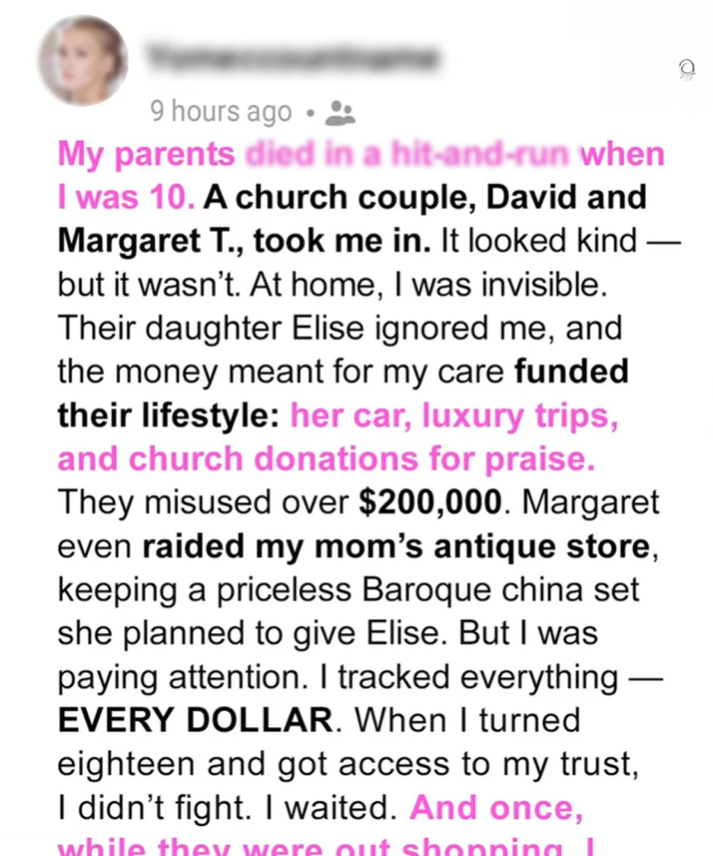 My parents died in a hit-and-run when I was 10. A church couple, David and Margaret T., took me in. It looked kind but it wasnโt. At home, I was invisible. Their daughter Elise ignored me, and the money meant for my care funded their lifestyle: her car, luxury trips, and church donations for praise. They misused over $200,000. Margaret even raided my momโs antique store, keeping a priceless Baroque china set she planned to give Elise. But I was paying attention. I tracked everything โ EVERY DOLLAR. When I turned eighteen and got access to my trust, I didnโt fight. I waited. And once, while they were out shopping I snuck into Margaretโs study and took photos of every document I could find. Bank statements, receipts, even a little notebook with all their expenses jotted down in Margaretโs loopy handwriting. It felt like holding my whole childhood in my hands.