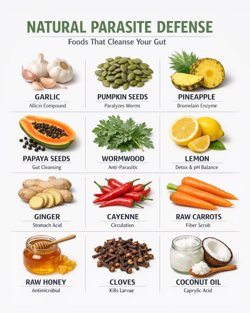To further protect the “internal garden,” we must also maintain a strong Natural Parasite Defense. Specific foods contain unique compounds that cleanse the gut and eliminate unwanted guests: