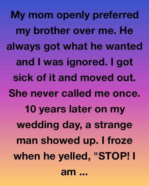 My mom openly preferred my brother over me. He always got what he wanted and I was ignored. I got sick of it and moved out. She never called me once. 10 years later on my wedding day, a strange man showed up. I froze when he yelled, “STOP! I am your father!”