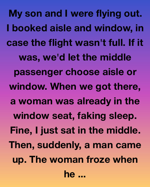 My son and I were flying out. I booked aisle and window, in case the flight wasn’t full. If it was, we’d let the middle passenger choose aisle or window. When we got there, a woman was already in the window seat, faking sleep. Fine, I just sat in the middle. Then, suddenly, a man came up. The woman froze when he approached.