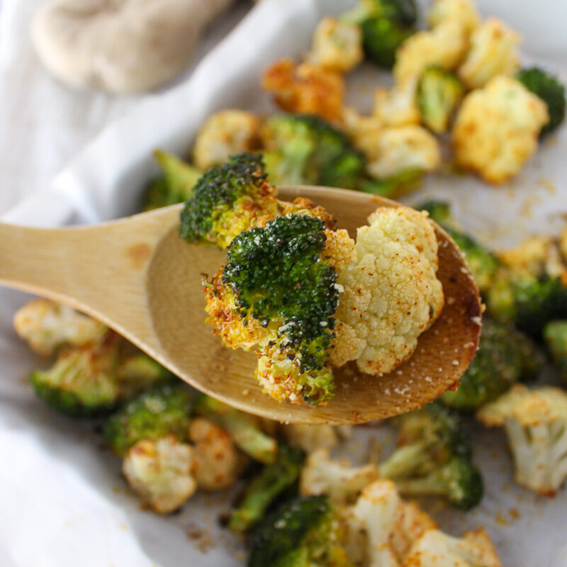 Wash and cut the broccoli and cauliflower into bite-sized florets. Pat them dry so they roast nicely instead of steaming.