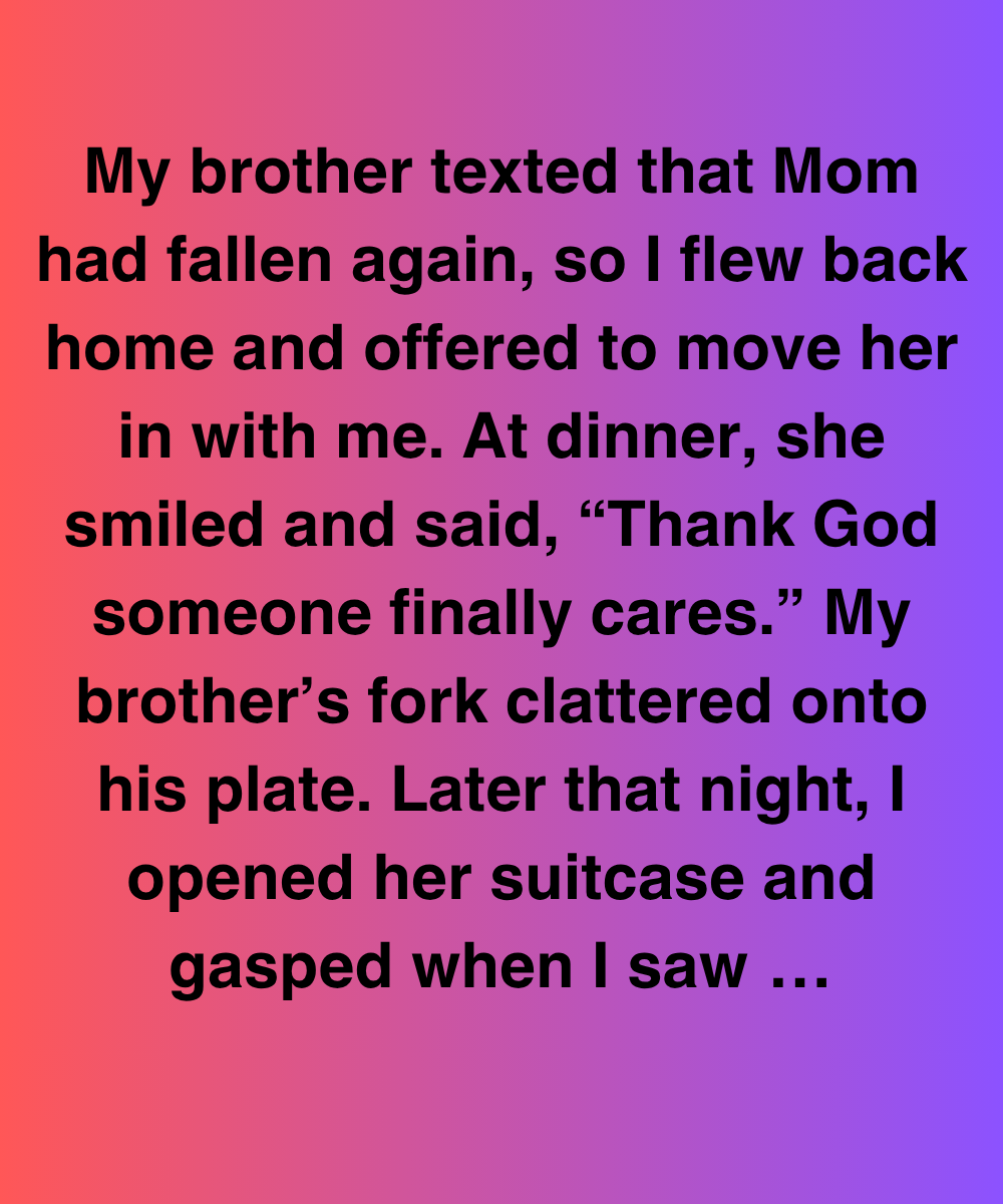 My brother texted that Mom had fallen again, so I flew back home and offered to move her in with me. At dinner, she smiled and said, โThank God someone finally cares.โ My brotherโs fork clattered onto his plate. Later that night, I opened her suitcase and gasped when I saw her house keys, a jewelry box I hadnโt seen since Dad died, and an envelope marked โDO NOT TRUST MARCUS.โ