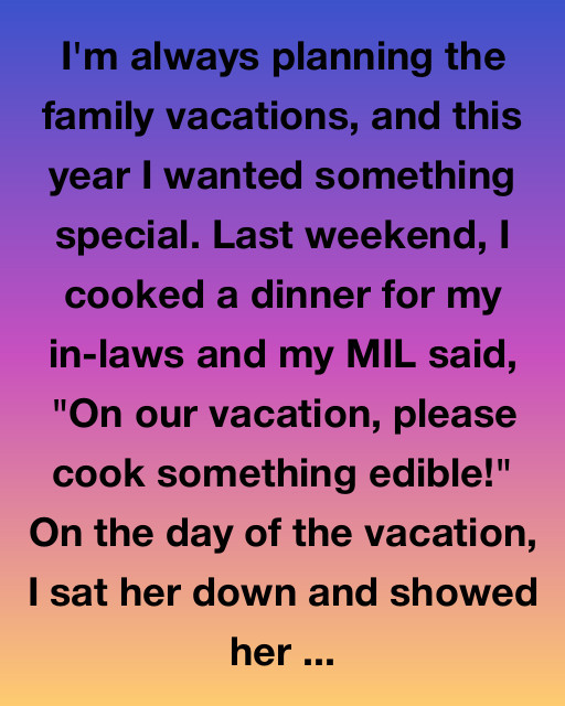 I’m always planning the family vacations, and this year I wanted something special. Last weekend, I cooked a dinner for my in-laws and my MIL said, ‘On our vacation, please cook something edible!’ On the day of the vacation, I sat her down and showed her the itinerary.