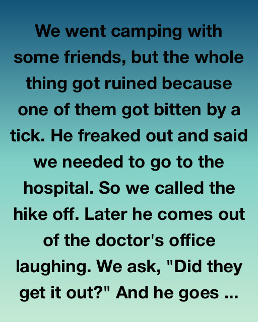 We went camping with some friends, but the whole thing got ruined because one of them got bitten by a tick. He freaked out and said we needed to go to the hospital. So we called the hike off. Later he comes out of the doctor’s office laughing. We ask, “Did they get it out?” And he goes, “There was no tick. It was a sesame seed from the burger I ate in the car.”